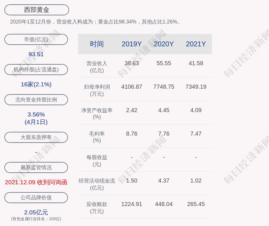 每经AI快讯,西部黄金(SH 601069,收盘价:14.55元)4月6日晚间发布年度业绩报告称,2021年营业收入约41.58亿元,同比减少25.15%;归属于上市公司股东的净利润约7349万元,同比减少5.16%;基本每股收益0.1156元,同比减少5.09%。每10股派发现金红利0.35元(含税)合计分配金额约2249万元、不送红股、不转增。