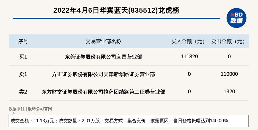 每经讯,2022年4月6日,新三板基础层公司华翼蓝天(835512)登上龙虎榜,交易方式是集合竞价,披露原因是当日价格振幅达到140.00%,成交数量2.01万股,成交金额11.13万元。买一席位为东莞证券股份有限公司宜昌营业部,买入11.13万元;卖一席位为方正证券股份有限公司天津新华路证券营业部,卖出11万元。
