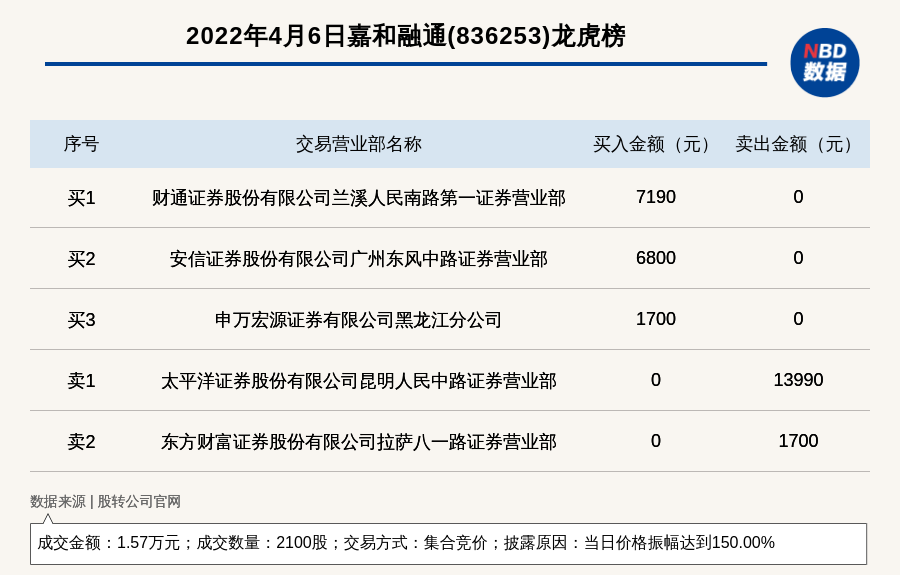 每经讯,2022年4月6日,新三板创新层公司嘉和融通(836253)登上龙虎榜,交易方式是集合竞价,披露原因是当日价格振幅达到150.00%,成交数量2100股,成交金额1.57万元。买一席位为财通证券股份有限公司兰溪人民南路第一证券营业部,买入7190元;卖一席位为太平洋证券股份有限公司昆明人民中路证券营业部,卖出1.4万元。