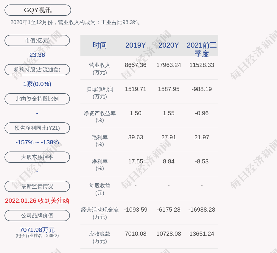 2020年1至12月份,GQY视讯的营业收入构成为:工业占比98.3%。