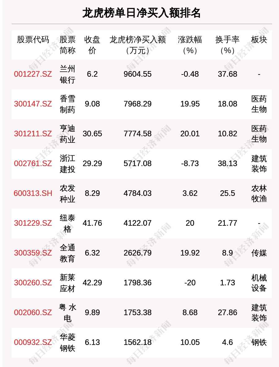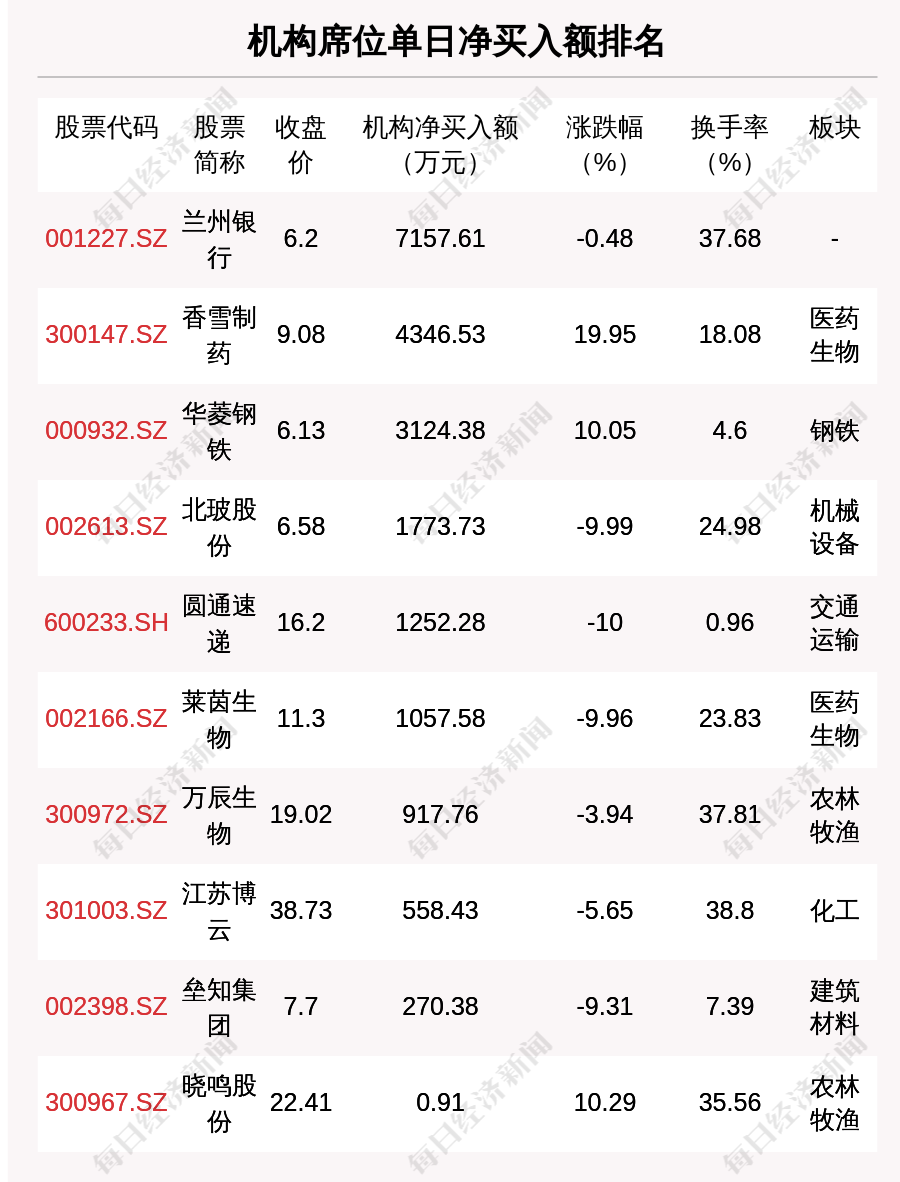 在龙虎榜中,涉及机构专用席位的个股有21只,净买入额前三的是兰州银行、香雪制药、华菱钢铁,分别为7157.61万元、4346.53万元、3124.38万元。