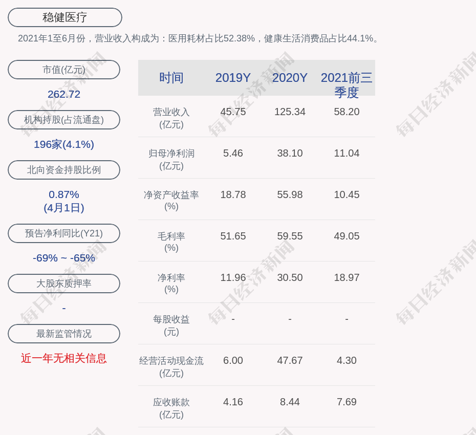 2021年1至6月份,稳健医疗的营业收入构成为:医用耗材占比52.38%,健康生活消费品占比44.1%。