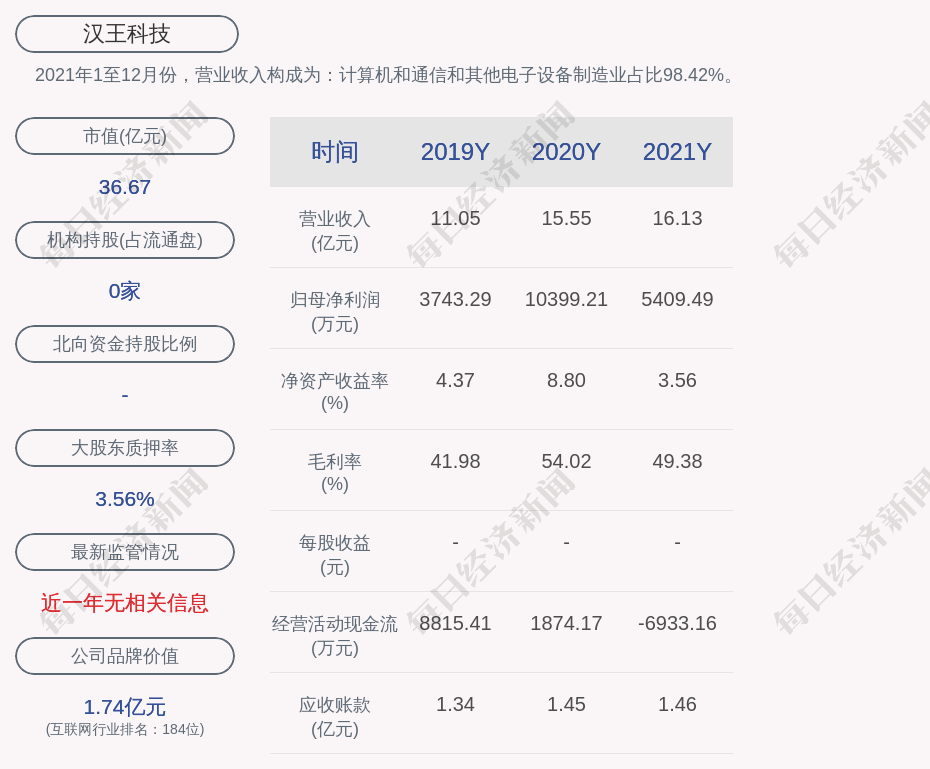 2021年1至12月份,汉王科技的营业收入构成为:计算机和通信和其他电子设备制造业占比98.42%。