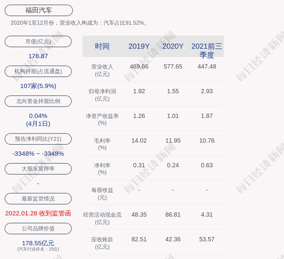 2020年1至12月份,福田汽车的营业收入构成为:汽车占比91.52%。
