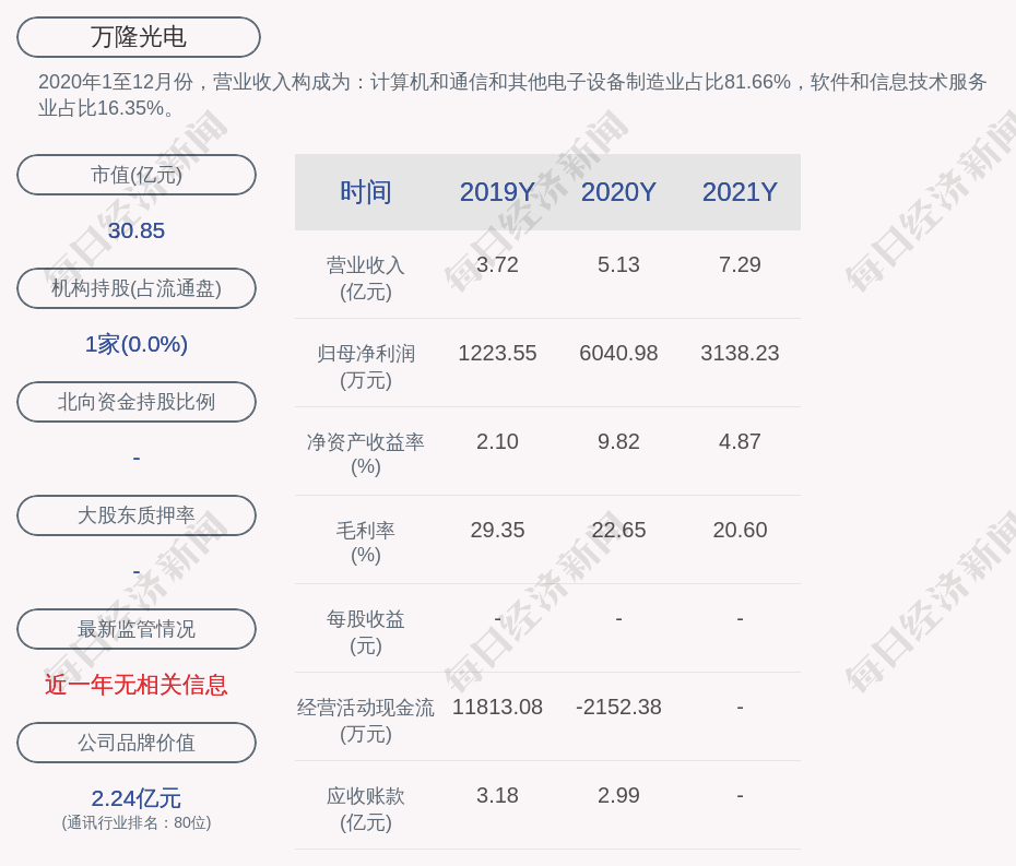 2020年1至12月份,万隆光电的营业收入构成为:计算机和通信和其他电子设备制造业占比81.66%,软件和信息技术服务业占比16.35%。