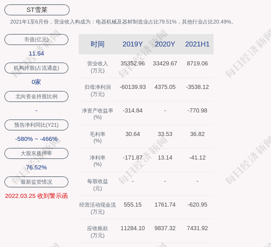 2021年1至6月份,ST雪莱的营业收入构成为:电器机械及器材制造业占比79.51%,其他行业占比20.49%。