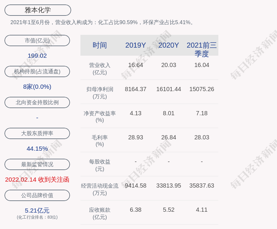 2021年1至6月份,雅本化学的营业收入构成为:化工占比90.59%,环保产业占比5.41%。