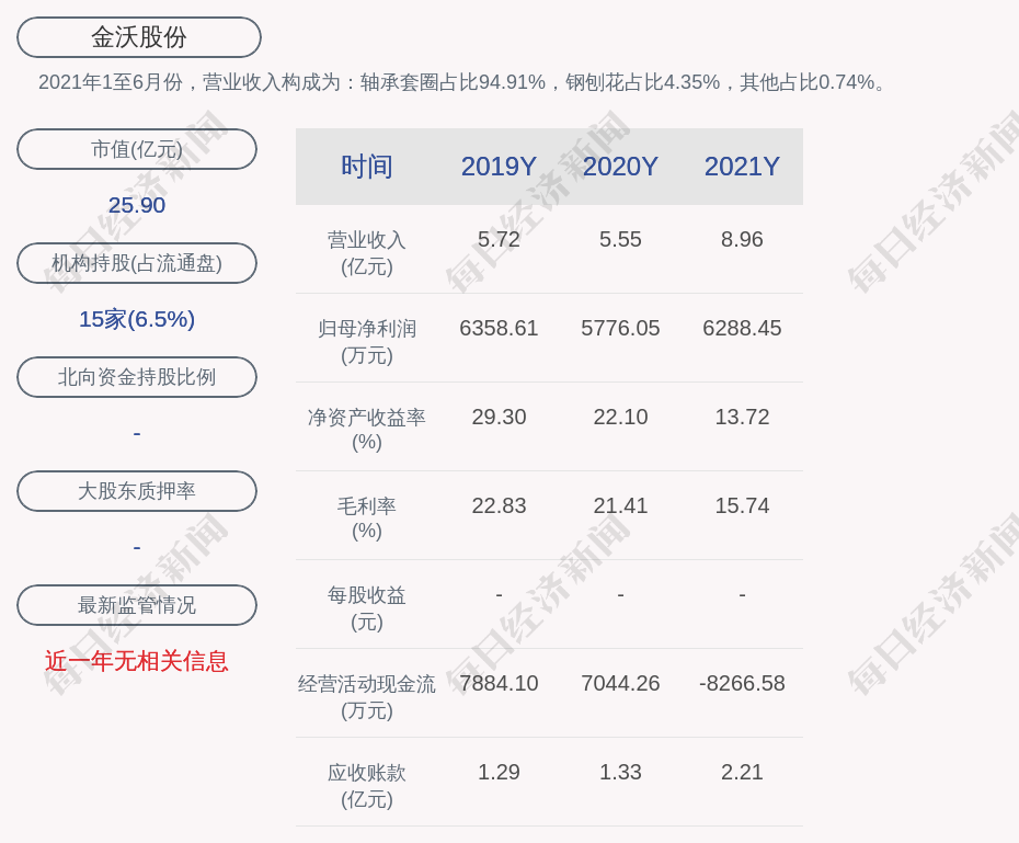 2021年1至6月份,金沃股份的营业收入构成为:轴承套圈占比94.91%,钢刨花占比4.35%,其他占比0.74%。
