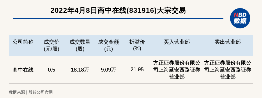 每经讯,2022年4月8日,新三板基础层公司商中在线(831916)发生一笔大宗交易,成交价0.5元/股,成交数量18.18万股,成交金额9.09万元,溢价21.95%。买入营业部是方正证券股份有限公司上海延安西路证券营业部,卖出营业部是方正证券股份有限公司上海延安西路证券营业部。