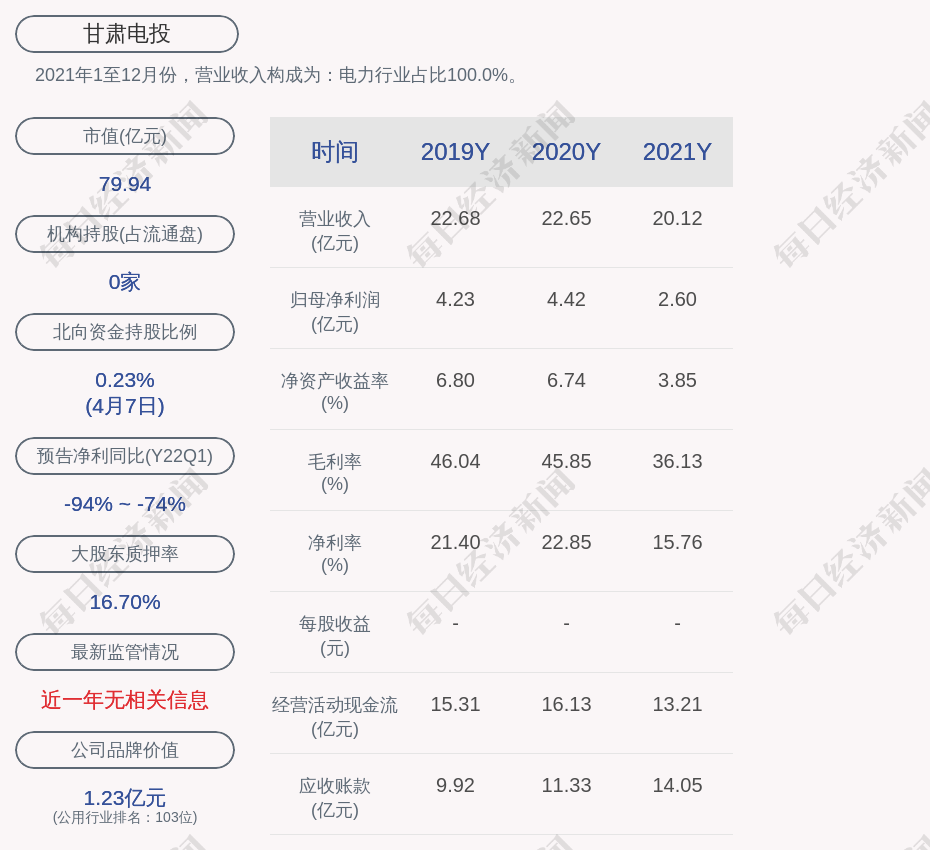 2021年1至12月份,甘肃电投的营业收入构成为:电力行业占比100.0%。