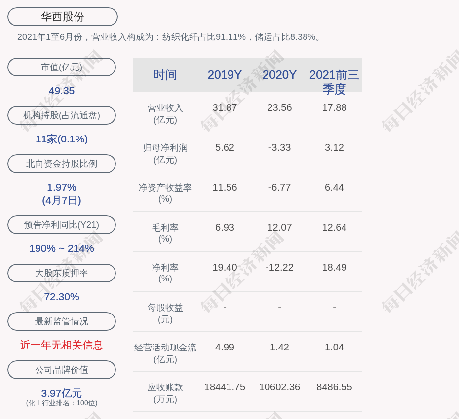 2021年1至6月份,华西股份的营业收入构成为:纺织化纤占比91.11%,储运占比8.38%。
