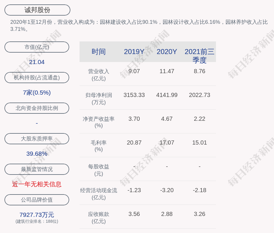 2020年1至12月份,诚邦股份的营业收入构成为:园林建设收入占比90.1%,园林设计收入占比6.16%,园林养护收入占比3.71%。