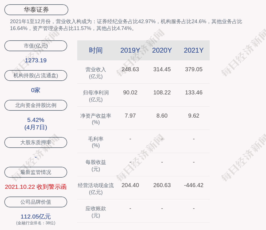 2021年1至12月份,华泰证券的营业收入构成为:证券经纪业务占比42.97%,机构服务占比24.6%,其他业务占比16.64%,资产管理业务占比11.57%,其他占比4.74%。