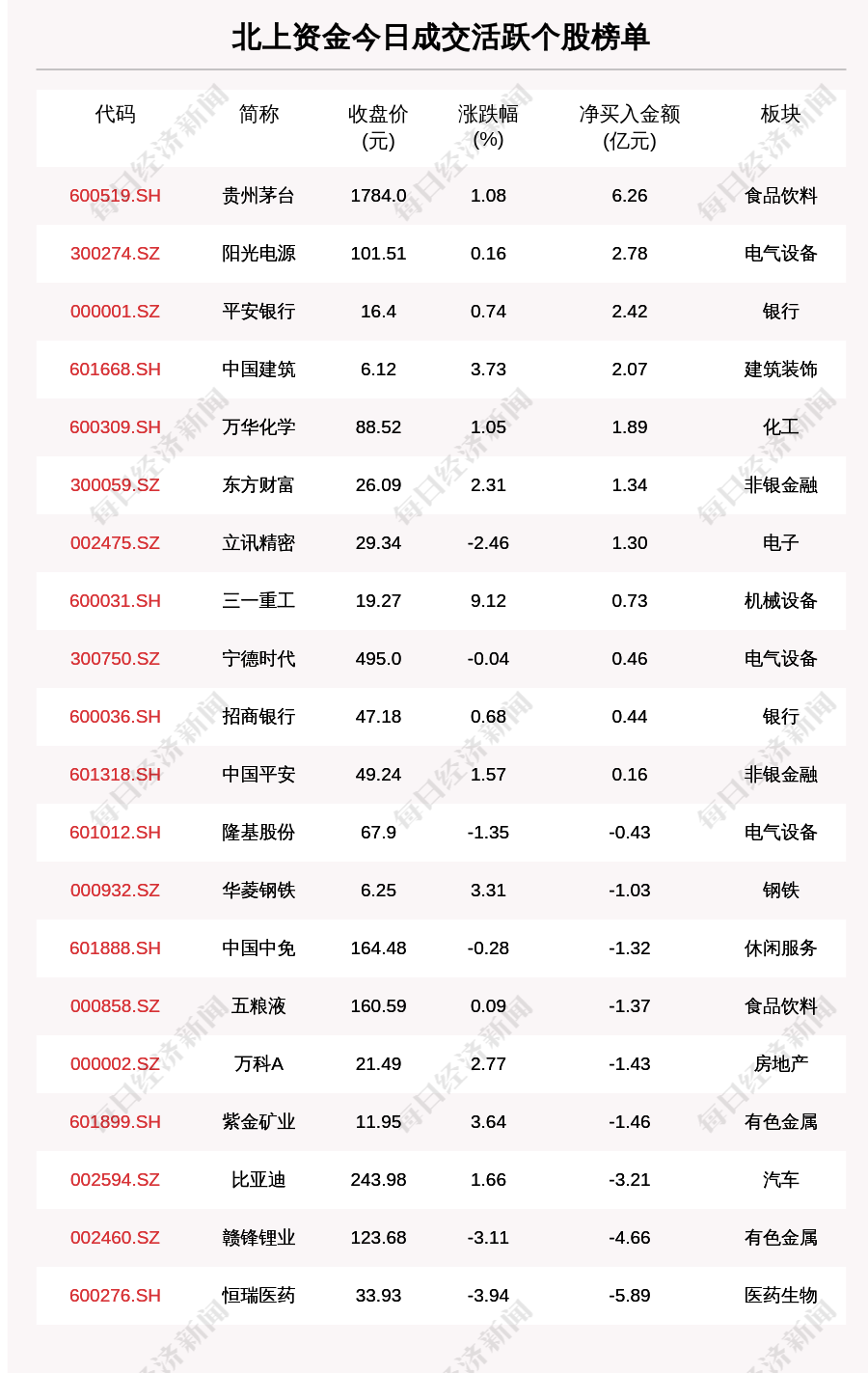 4月8日,北上资金成交活跃个股榜单中,净买入个股共11只,金额最多的是贵州茅台(600519.SH,收盘价:1784.0元),净买入6.261亿元;净卖出个股共9只,金额最多的是恒瑞医药(600276.SH,收盘价:33.93元),净卖出5.888亿元。