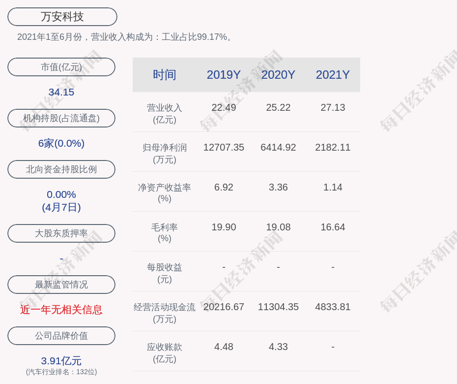 每经AI快讯,万安科技(SZ 002590,收盘价:7.12元)4月8日晚间发布年度业绩报告称,2021年营业收入约27.13亿元,同比增加7.58%;归属于上市公司股东的净利润约2182万元,同比减少65.98%;基本每股收益0.05元,同比减少61.54%。拟每10股派发现金红利0.85元(含税)、不送红股、不转增。