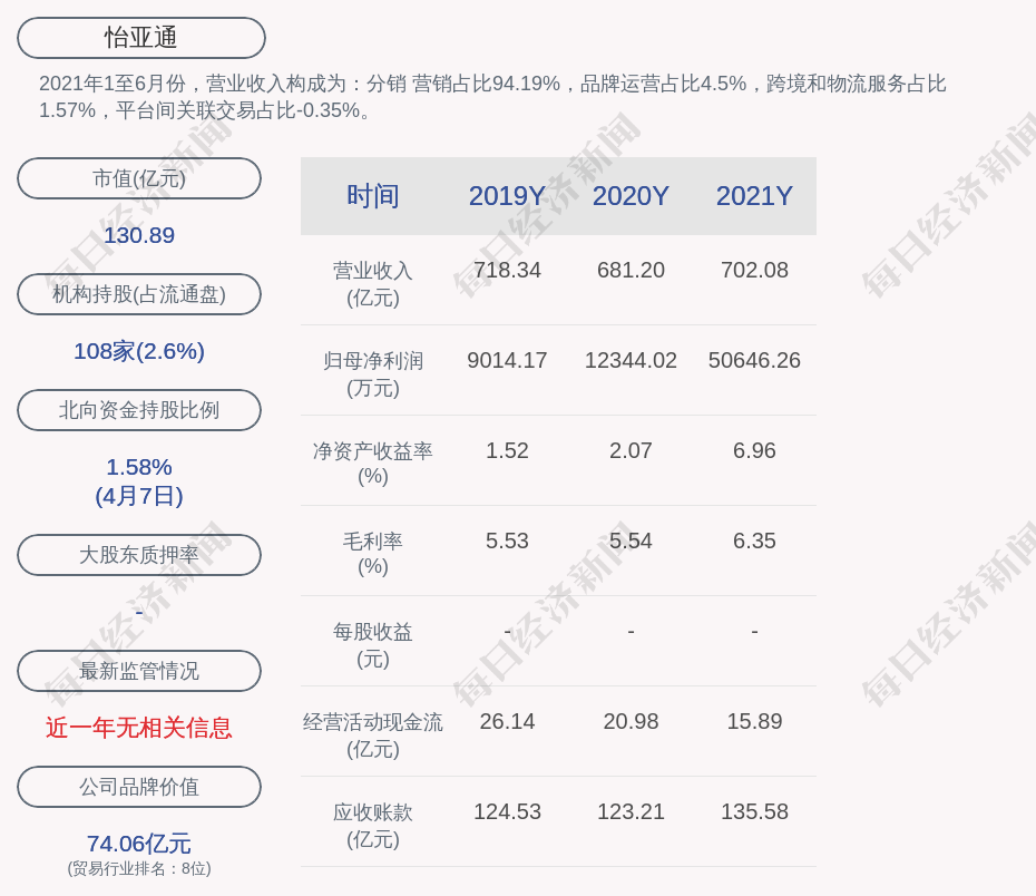 2021年1至6月份,怡亚通的营业收入构成为:分销+营销占比94.19%,品牌运营占比4.5%,跨境和物流服务占比1.57%,平台间关联交易占比-0.35%。