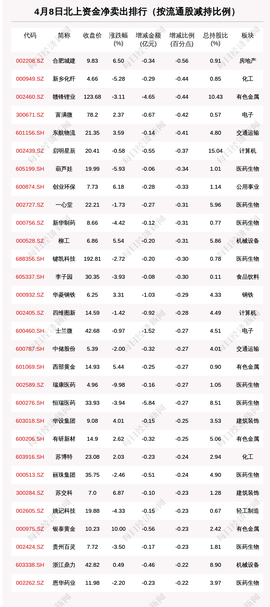 每经AI快讯,4月8日,北上资金净卖出的个股共有766只,北上资金减仓比例超1%的有634只。其中,合肥城建(002208.SZ,收盘价:9.83元)减仓比例最为明显,最新持股比例0.91%,环比减少0.56个百分点。其他北上资金减仓比例较多的个股还包括新乡化纤(000949.SZ,收盘价:4.66元)、赣锋锂业(002460.SZ,收盘价:123.68元)、富满微(300671.SZ,收盘价:78.2元)。