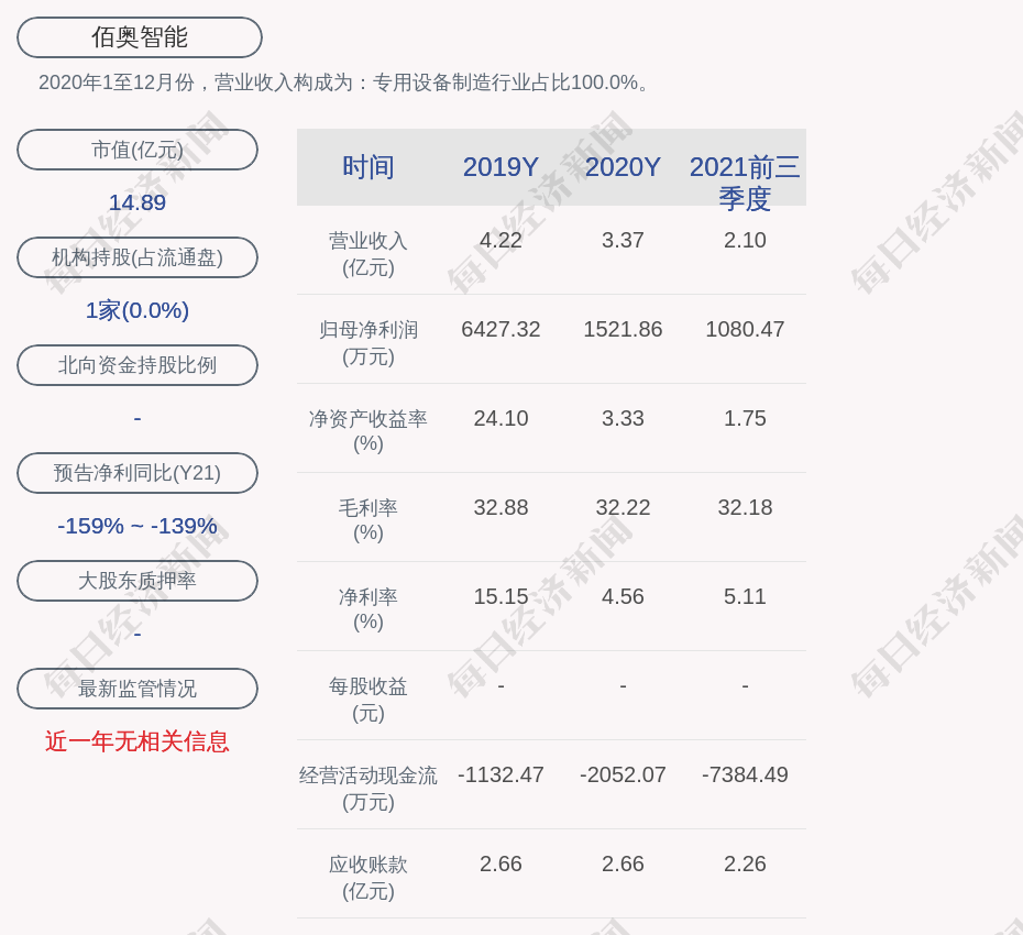 2020年1至12月份,佰奥智能的营业收入构成为:专用设备制造行业占比100.0%。