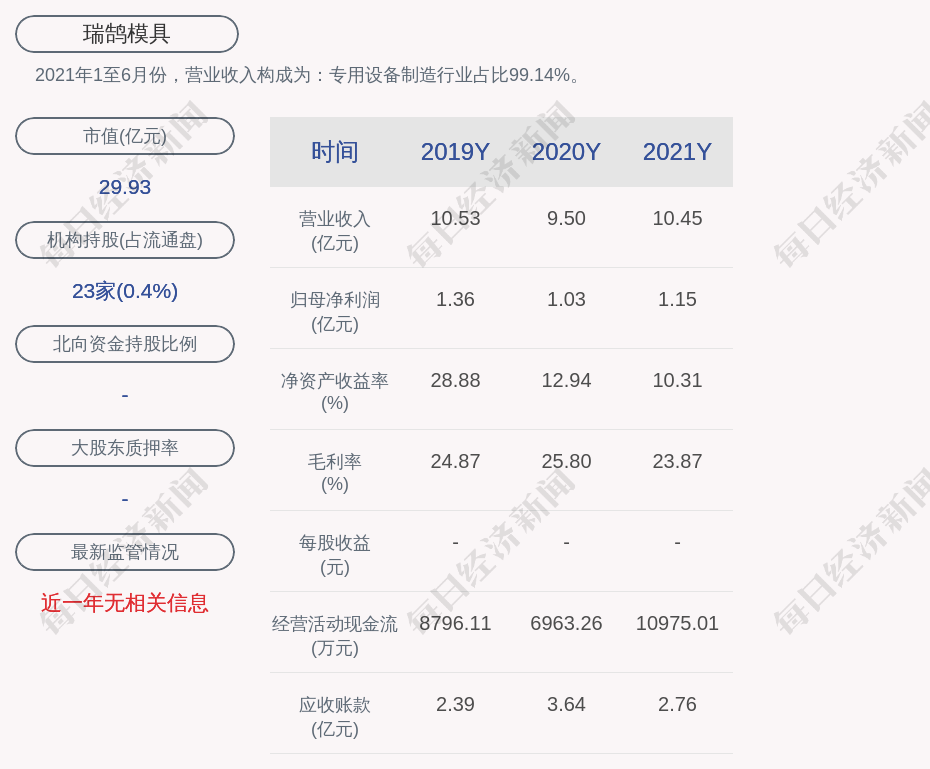 2021年1至6月份,瑞鹄模具的营业收入构成为:专用设备制造行业占比99.14%。