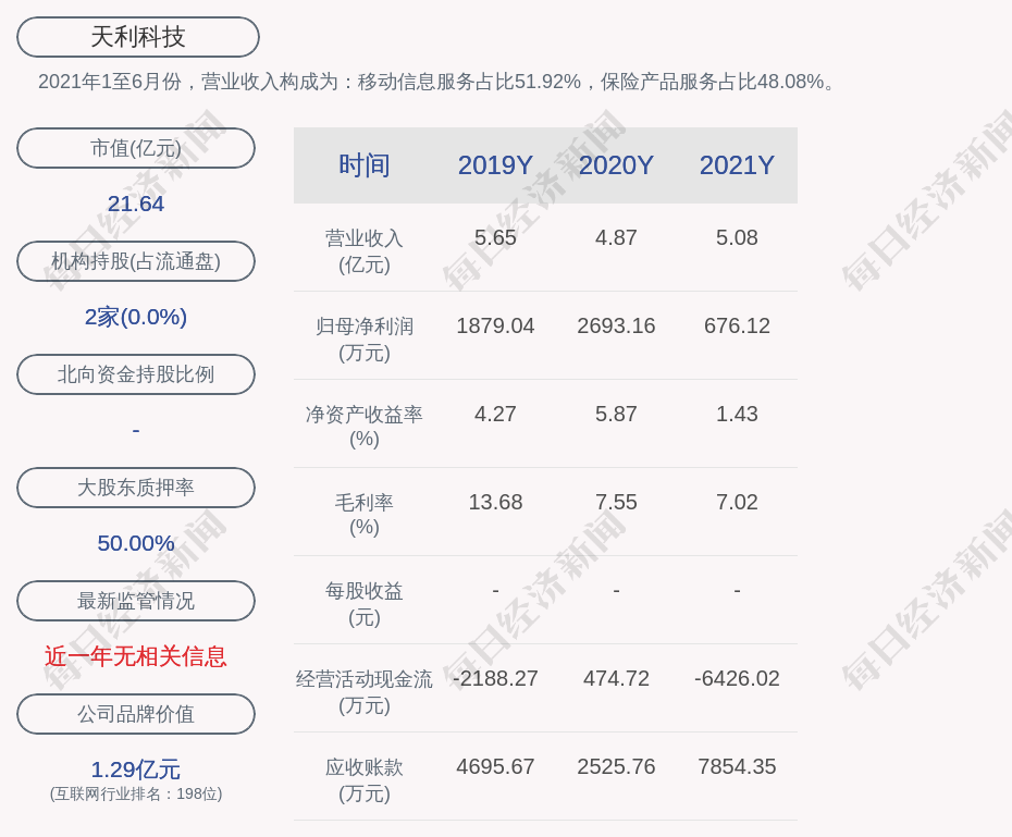 2021年1至6月份,天利科技的营业收入构成为:移动信息服务占比51.92%,保险产品服务占比48.08%。