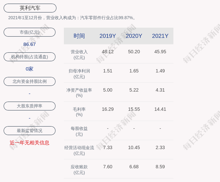 2021年1至12月份,英利汽车的营业收入构成为:汽车零部件行业占比99.87%。