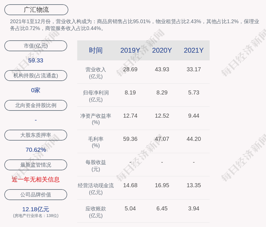 2021年1至12月份,广汇物流的营业收入构成为:商品房销售占比95.01%,物业租赁占比2.43%,其他占比1.2%,保理业务占比0.72%,商管服务收入占比0.44%。
