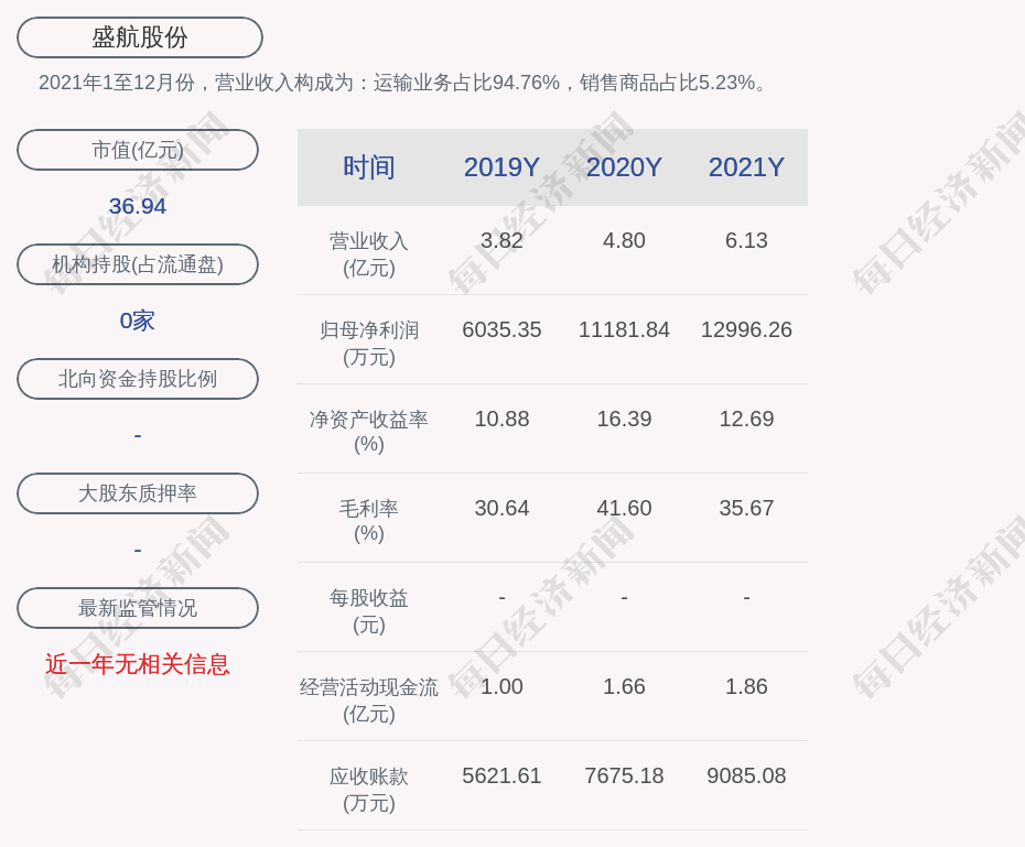2021年1至12月份,盛航股份的营业收入构成为:运输业务占比94.76%,销售商品占比5.23%。