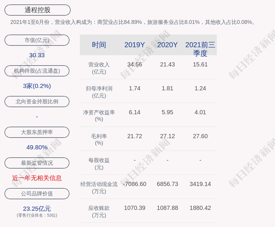 2021年1至6月份,通程控股的营业收入构成为:商贸业占比84.89%,旅游服务业占比8.01%,其他收入占比0.08%。