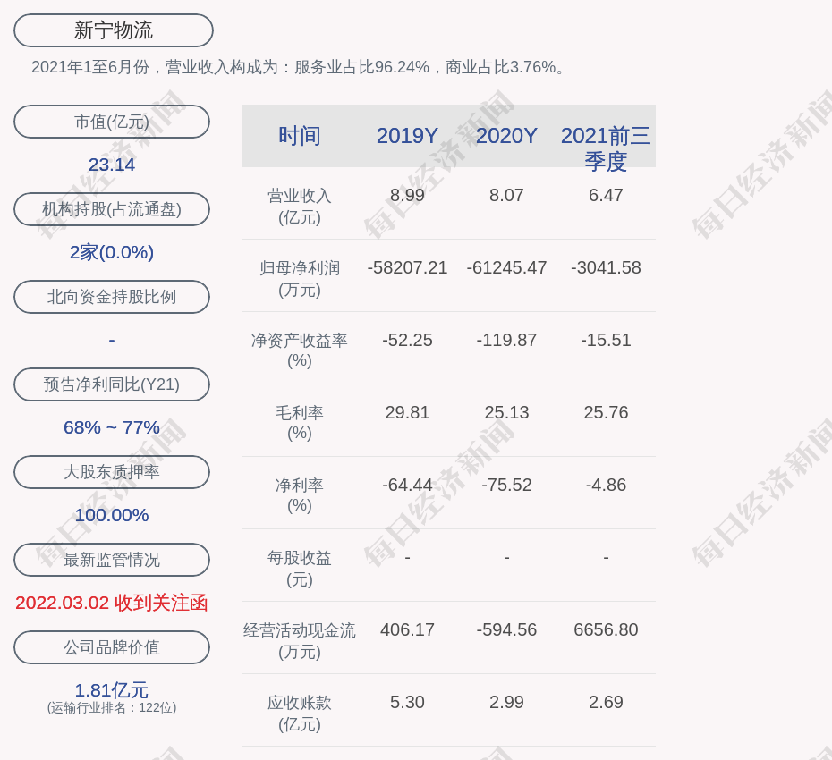 2021年1至6月份,新宁物流的营业收入构成为:服务业占比96.24%,商业占比3.76%。