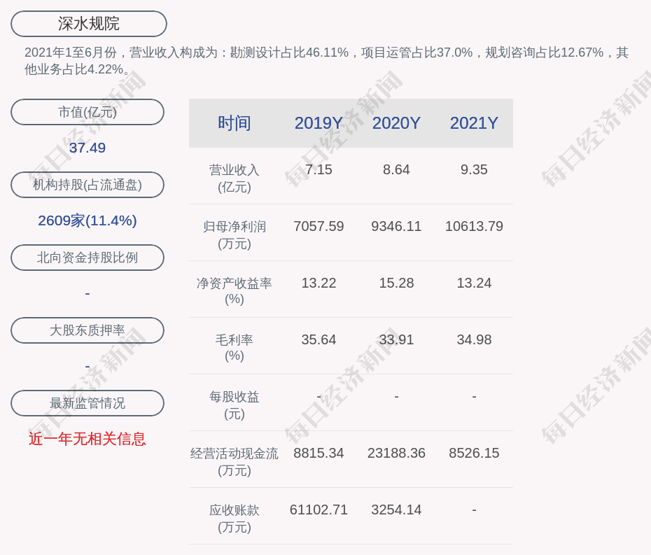 2021年1至6月份,深水规院的营业收入构成为:勘测设计占比46.11%,项目运管占比37.0%,规划咨询占比12.67%,其他业务占比4.22%。