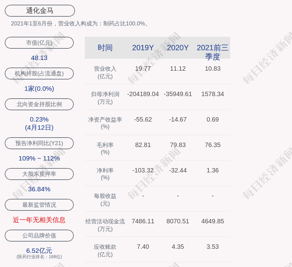 2021年1至6月份,通化金马的营业收入构成为:制药占比100.0%。