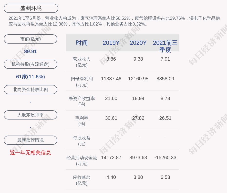 2021年1至6月份,盛剑环境的营业收入构成为:废气治理系统占比56.52%,废气治理设备占比29.76%,湿电子化学品供应与回收再生系统占比12.38%,其他占比1.02%,其他业务占比0.32%。