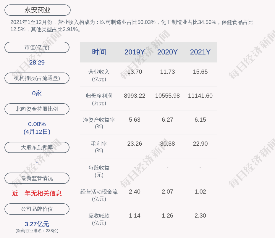 2021年1至12月份,永安药业的营业收入构成为:医药制造业占比50.03%,化工制造业占比34.56%,保健食品占比12.5%,其他类型占比2.91%。