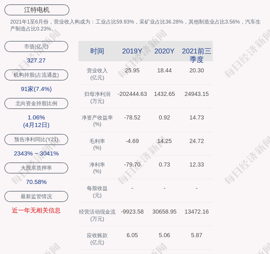 2021年1至6月份,江特电机的营业收入构成为:工业占比59.93%,采矿业占比36.28%,其他制造业占比3.56%,汽车生产制造占比0.23%。
