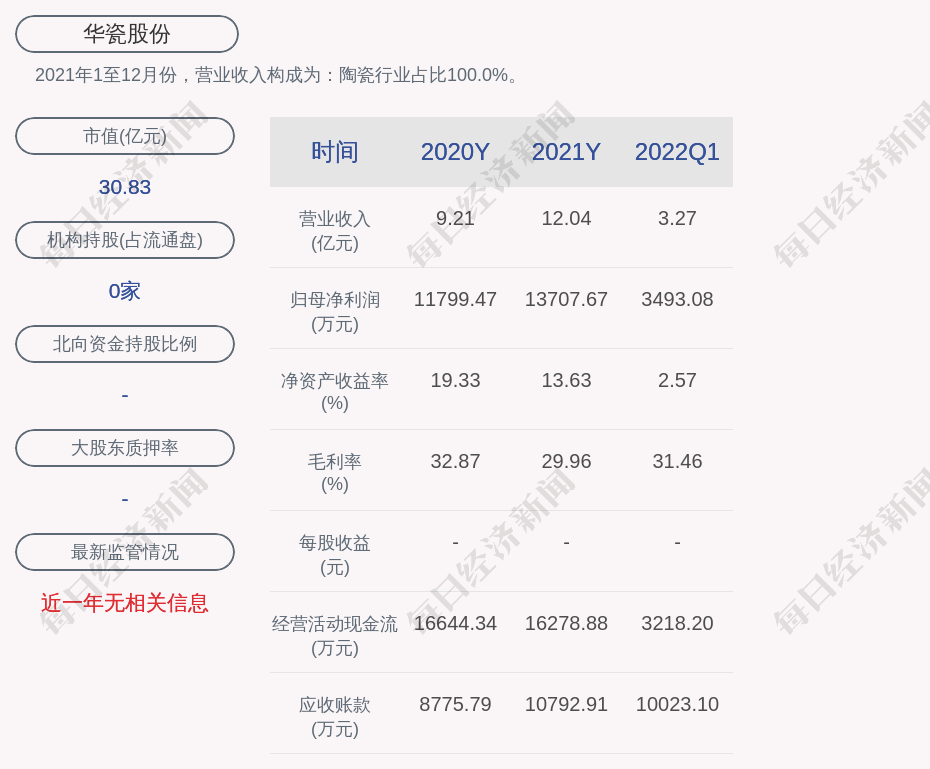 2021年1至12月份,华瓷股份的营业收入构成为:陶瓷行业占比100.0%。