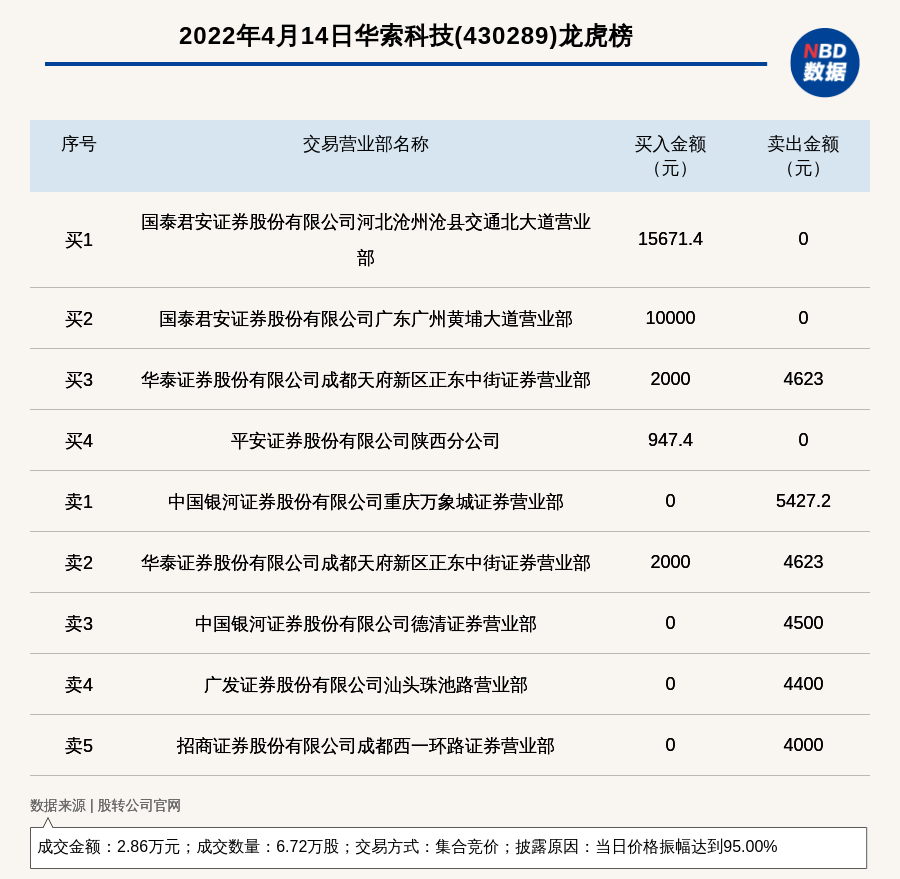 每经讯,2022年4月14日,新三板基础层公司华索科技(430289)登上龙虎榜,交易方式是集合竞价,披露原因是当日价格振幅达到95.00%,成交数量6.72万股,成交金额2.86万元。