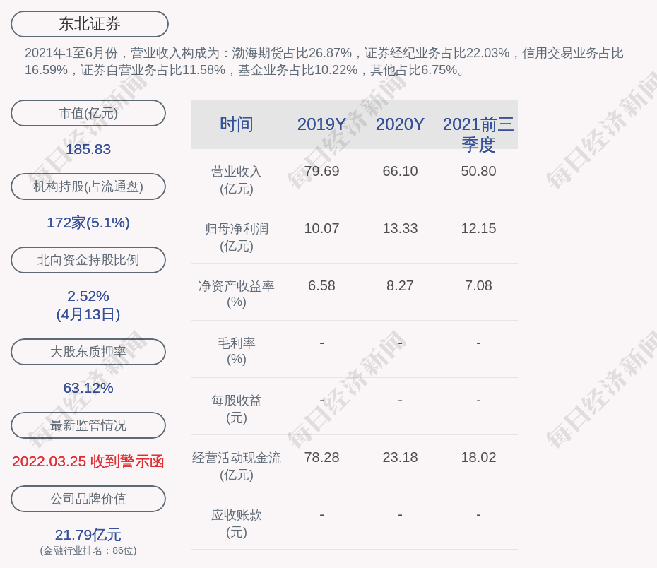 2021年1至6月份,东北证券的营业收入构成为:渤海期货占比26.87%,证券经纪业务占比22.03%,信用交易业务占比16.59%,证券自营业务占比11.58%,基金业务占比10.22%,其他占比6.75%。