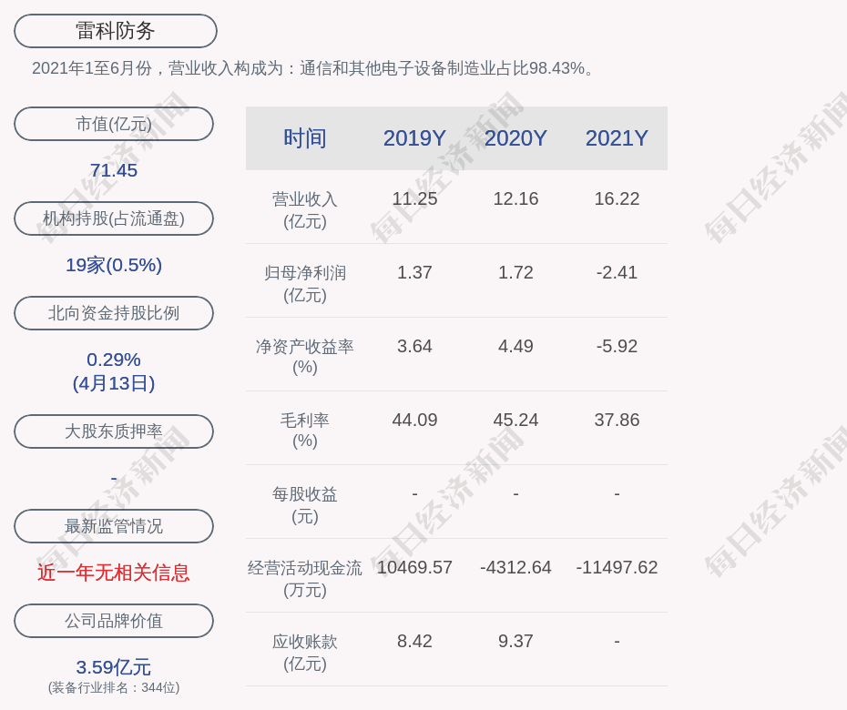 每经AI快讯,雷科防务(SZ 002413,收盘价:5.32元)4月14日晚间发布年度业绩报告称,2021年营业收入约16.22亿元,同比增加33.45%;归属于上市公司股东的净利润亏损约2.41亿元;基本每股收益亏损0.19元。拟不派现、不送红股、不转增。