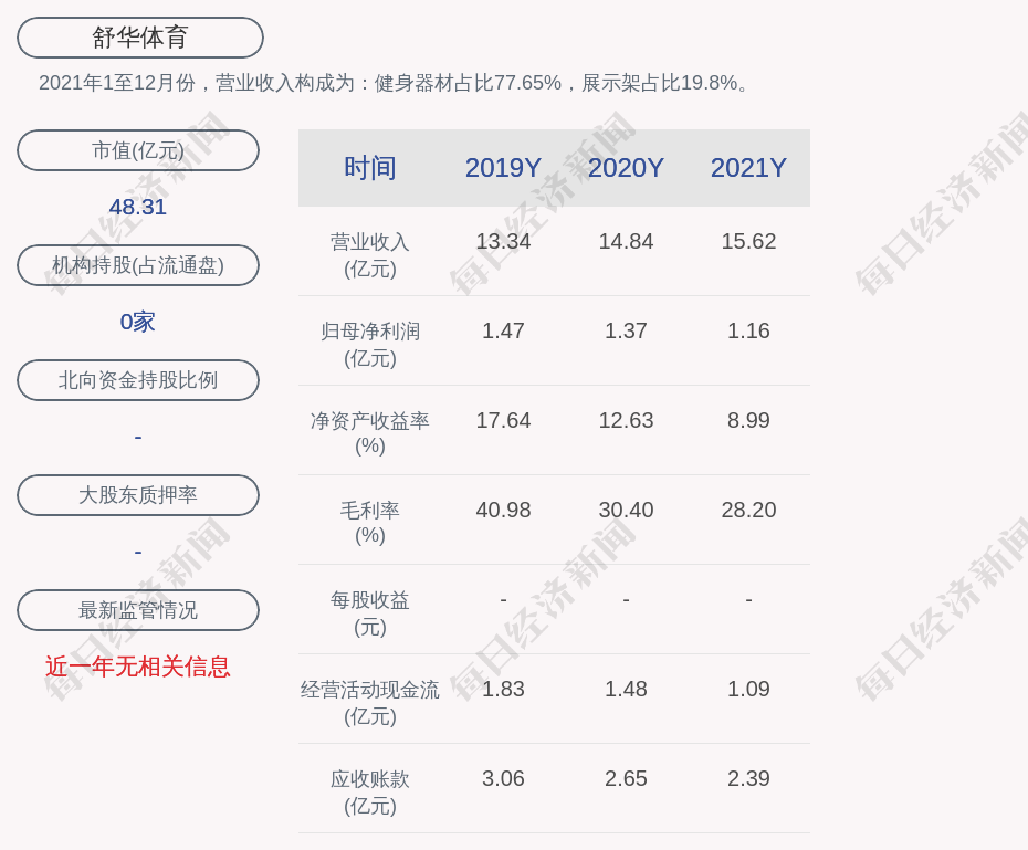 2021年1至12月份,舒华体育的营业收入构成为:健身器材占比77.65%,展示架占比19.8%。
