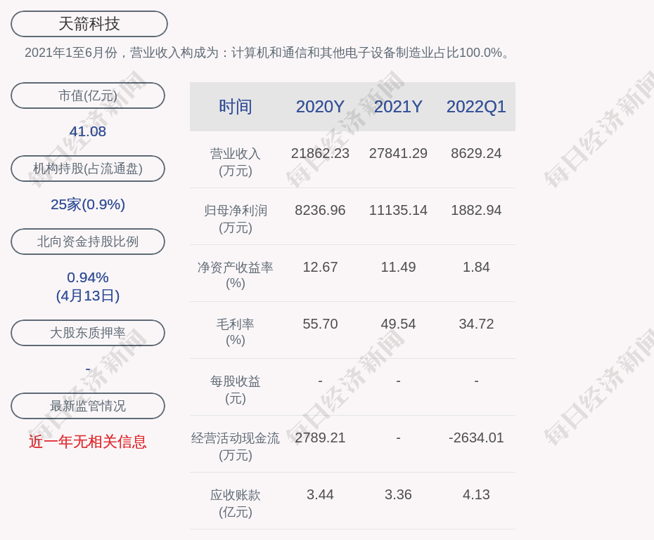 2021年1至6月份,天箭科技的营业收入构成为:计算机和通信和其他电子设备制造业占比100.0%。