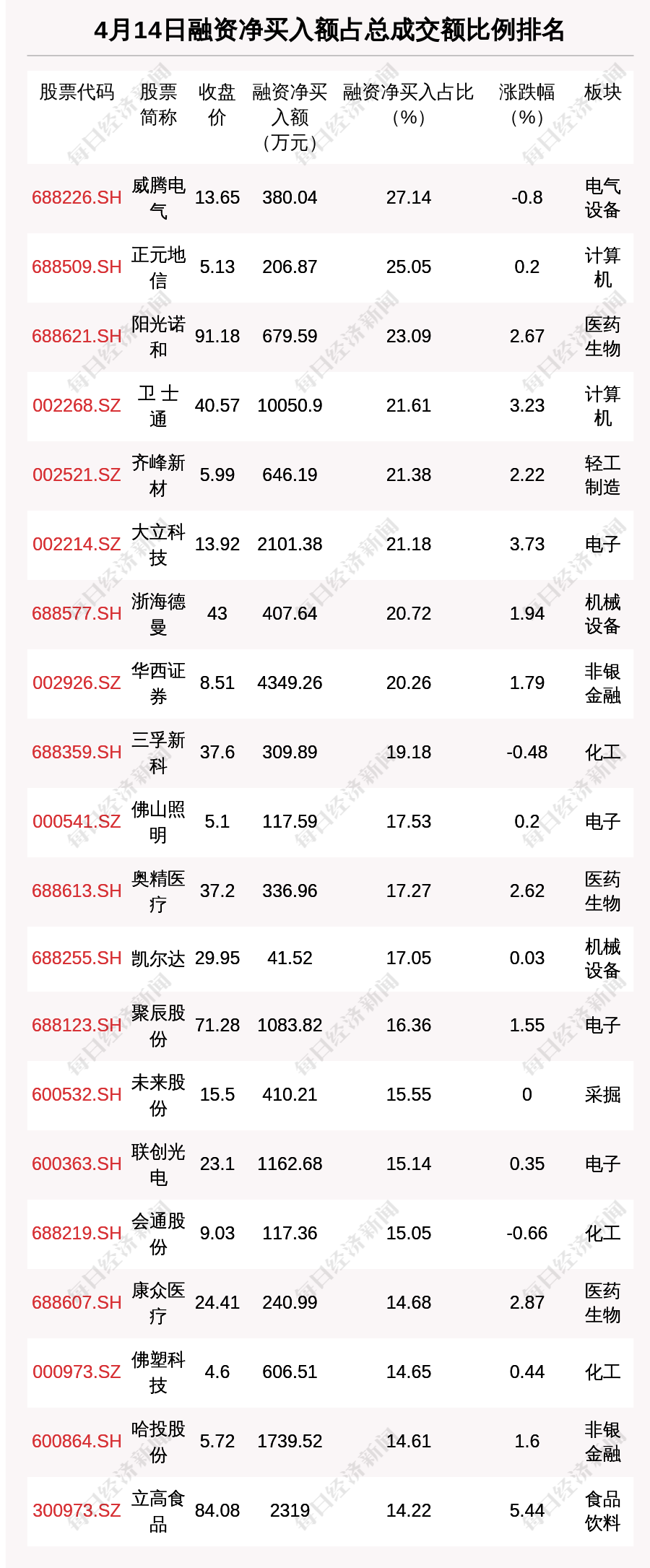 4月14日两市共有1047只个股有融资资金净买入。共有51只股票融资净买入额占总成交金额比例超10%,其中威腾电气、正元地信、阳光诺和排名前三,占比分别为27.14%、25.05%、23.09%。