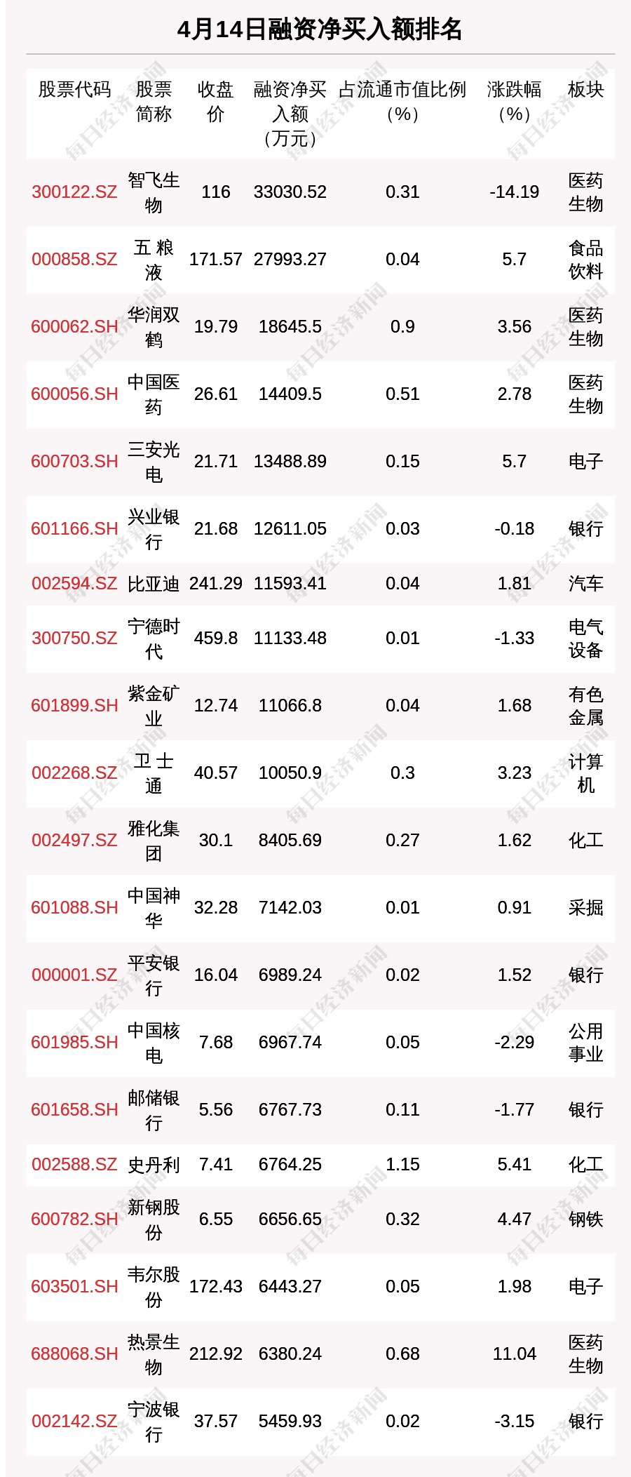 从融资资金净买入金额来看,共有10只个股净买入金额超亿元,其中智飞生物、五 粮 液、华润双鹤排名前三,买入金额分别为3.3亿元、2.8亿元、1.86亿元。