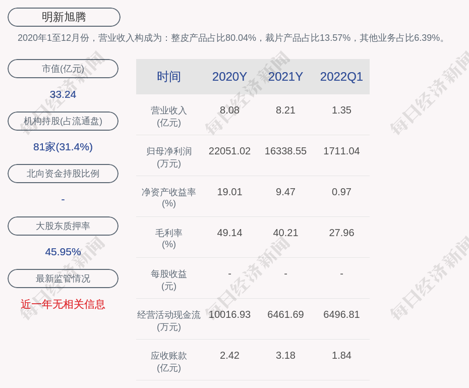 2020年1至12月份,明新旭腾的营业收入构成为:整皮产品占比80.04%,裁片产品占比13.57%,其他业务占比6.39%。