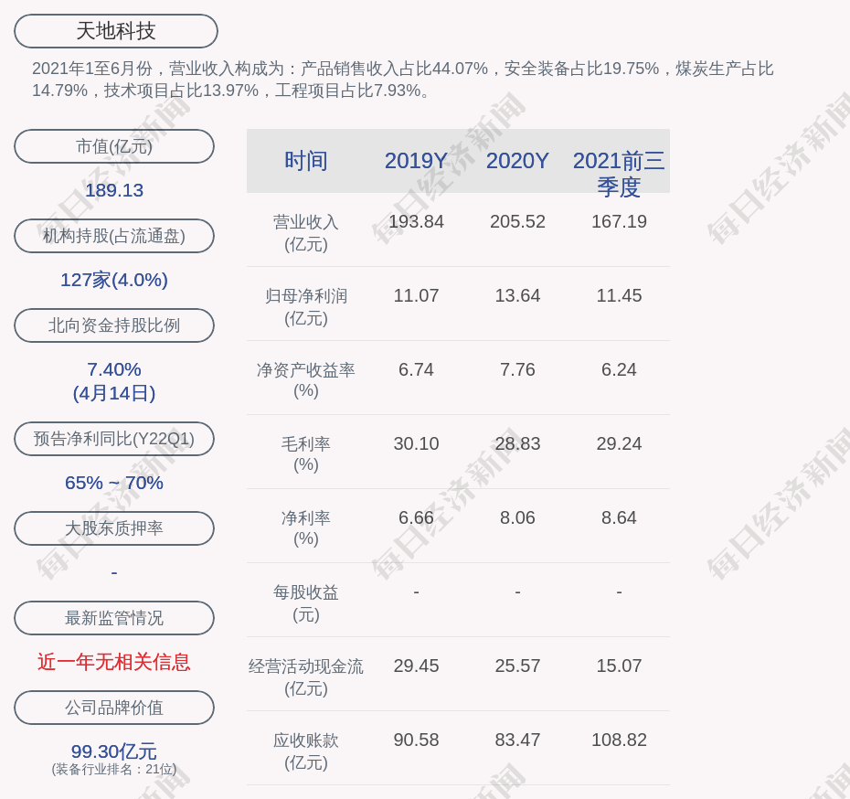 2021年1至6月份,天地科技的营业收入构成为:产品销售收入占比44.07%,安全装备占比19.75%,煤炭生产占比14.79%,技术项目占比13.97%,工程项目占比7.93%。