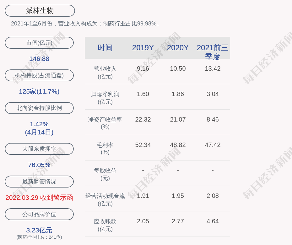 2021年1至6月份,派林生物的营业收入构成为:制药行业占比99.98%。