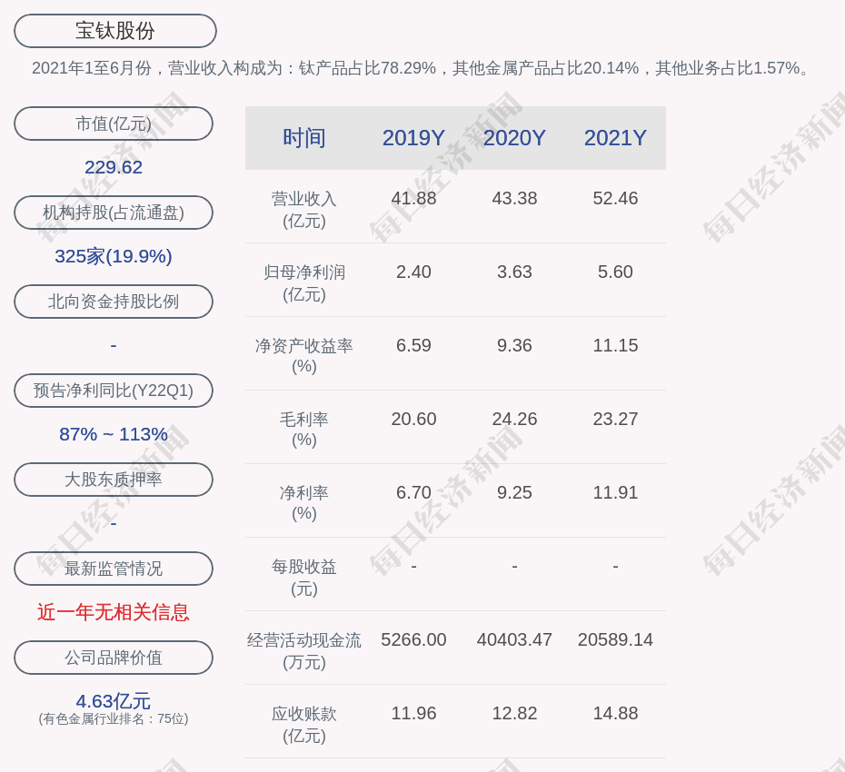每经AI快讯,宝钛股份(SH 600456,收盘价:48.06元)4月15日晚间发布年度业绩报告称,2021年营业收入约52.46亿元,同比增加20.94%;归属于上市公司股东的净利润约5.6亿元,同比增加54.49%;基本每股收益1.1825元,同比增加40.29%。拟每10股派发现金股利人民币8.5元(含税)。