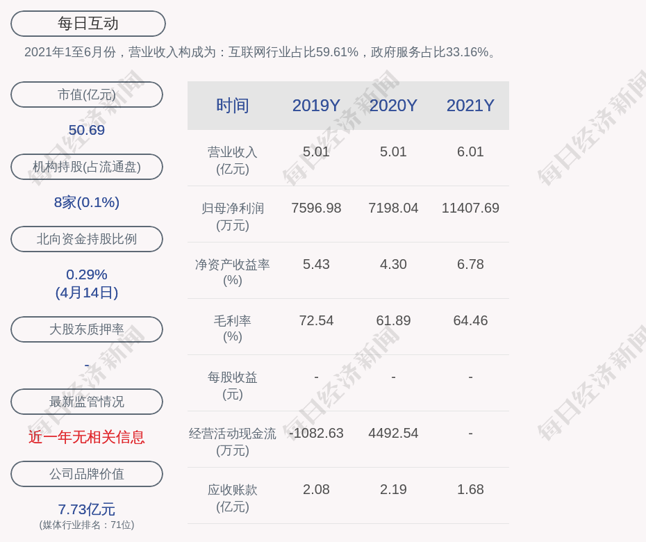 2021年1至6月份,每日互动的营业收入构成为:互联网行业占比59.61%,政府服务占比33.16%。