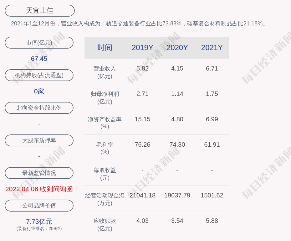 2021年1至12月份,天宜上佳的营业收入构成为:轨道交通装备行业占比73.83%,碳基复合材料制品占比21.18%。
