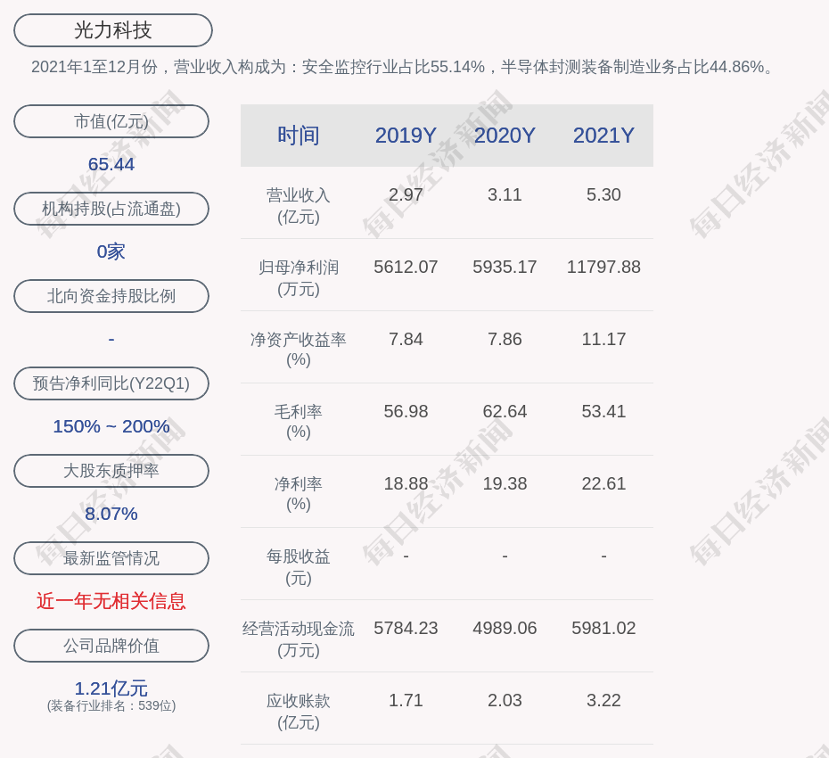 2021年1至12月份,光力科技的营业收入构成为:安全监控行业占比55.14%,半导体封测装备制造业务占比44.86%。