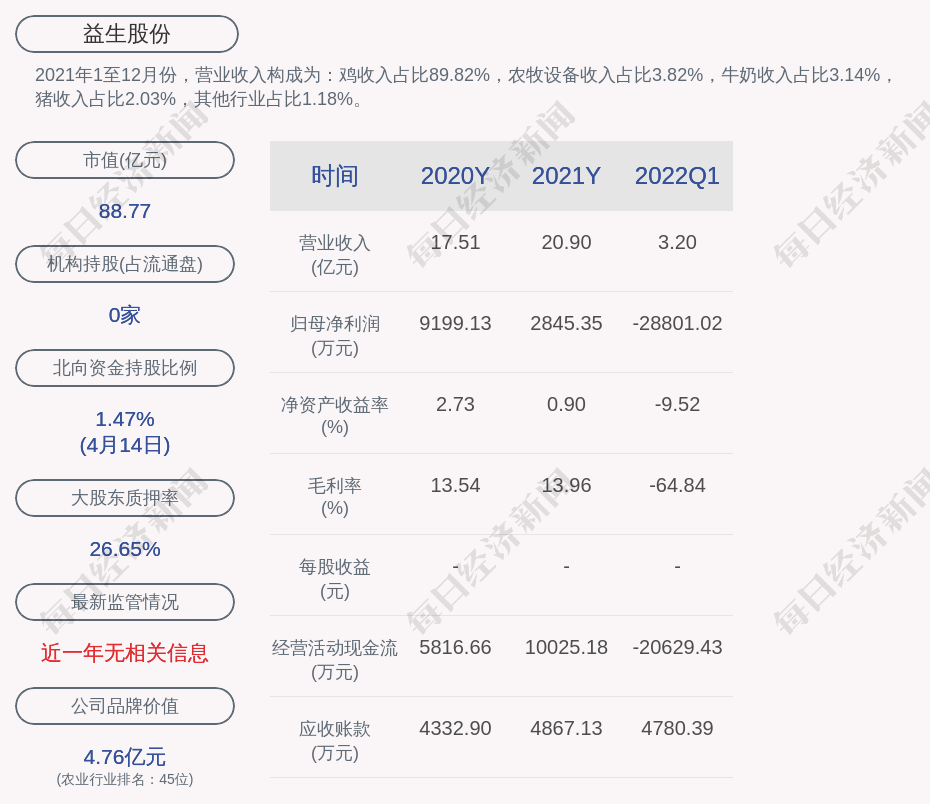 每经AI快讯,益生股份(SZ 002458,收盘价:8.94元)4月17日晚间发布公告称,截至本公告日,曹积生累计质押股数为9260万股,占其所持股份比例为22.67%。